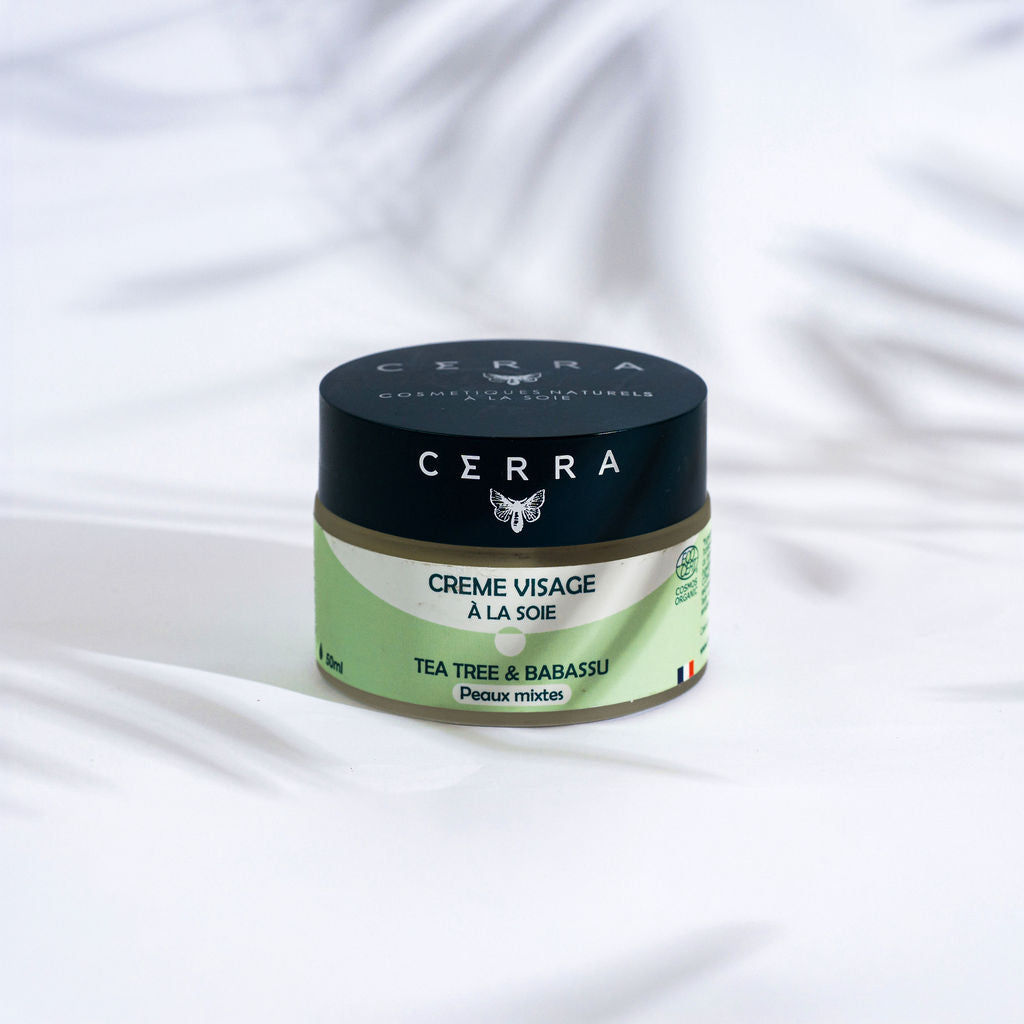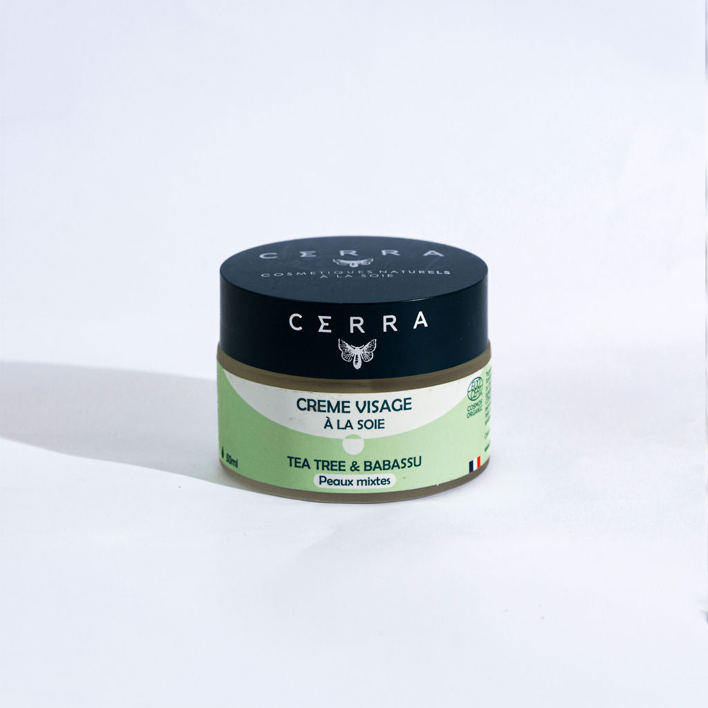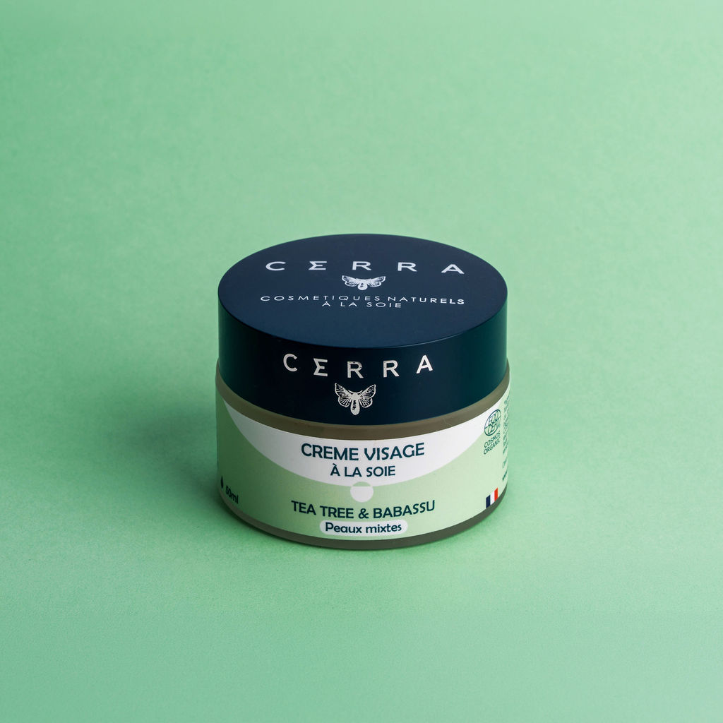Die Tagescreme Tea Tree & Babassu Cerra besteht aus Teebaumhydrolat, das die Haut reinigt, und Babassuöl, dessen Zusammensetzung dem Kokosnussöl ähnelt, jedoch keine komedogenen Wirkungen aufweist. Es ist reich an kurzkettigen Fettsäuren, die eine antimikrobielle Wirkung haben. Es enthält außerdem Glycerin, das die Haut mit Feuchtigkeit versorgt und weich macht , sowie gepuderte Seide, die Mischhaut mattiert .
